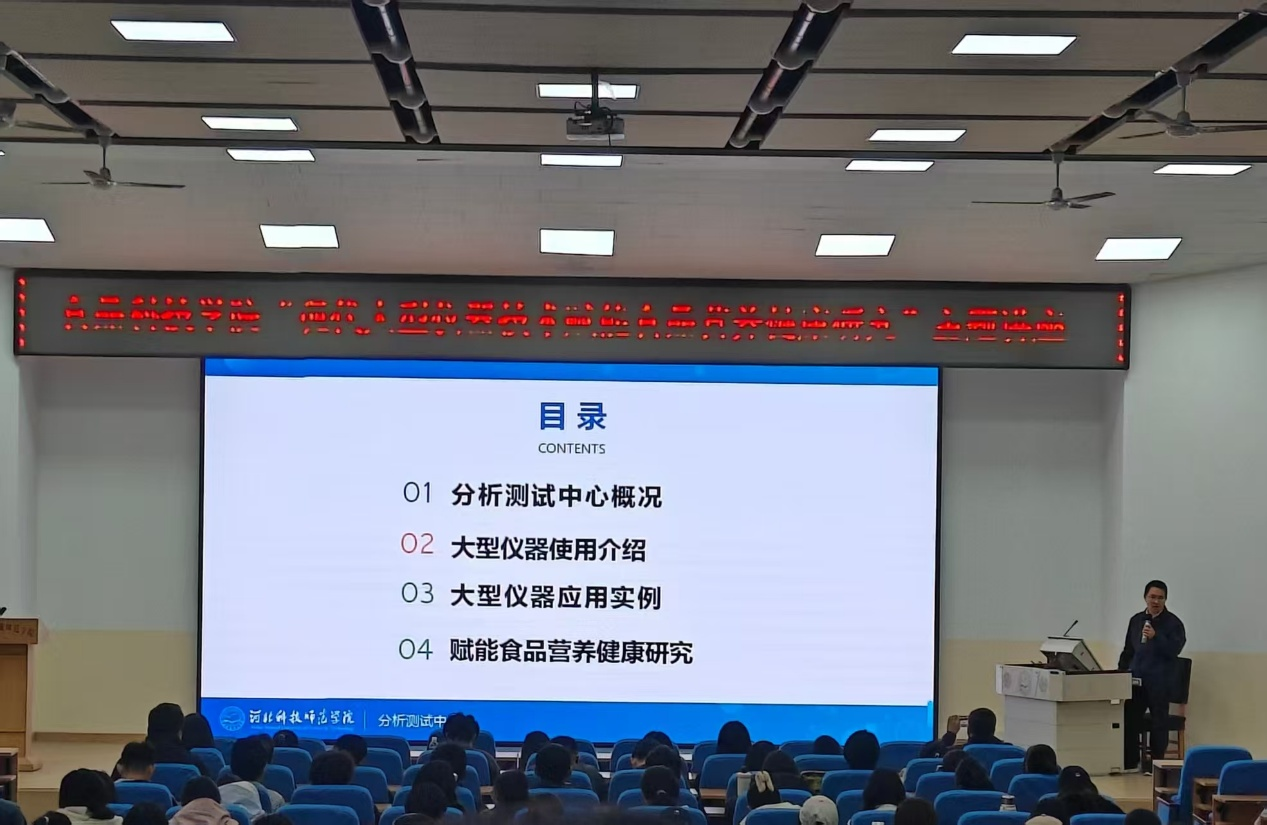 11月6日,食品科技学院在昌黎校区学术报告厅成功开展“现代大型仪器技术赋能食品营养健康研究”主题讲座。本次讲座由学校分析测试中心主任杜彬老师担任主讲,各院系师生代表踊跃参与。
