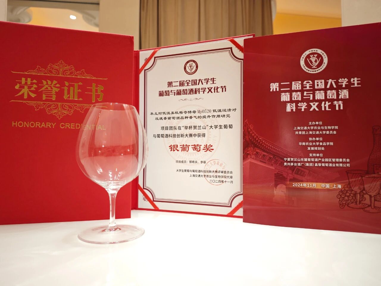 2024年11月24日,第二届全国大学生葡萄与葡萄酒科学文化节在上海交通大学闵行校区隆重举办。食品科技学院暨葡萄酒学院阎贺静老师指导的研究生郭希庆、李菲的项目团队在“举杯贺兰山”大学生葡萄与葡萄酒科技创新大赛中荣获“银葡萄奖”。