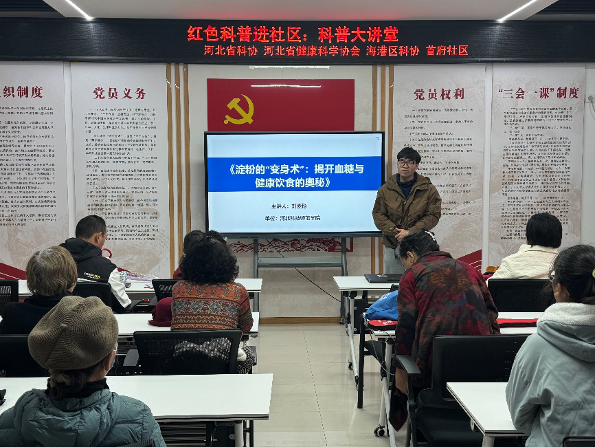 为积极响应国家“健康中国”战略,普及食品营养健康知识,由河北省科学技术协会、河北省健康科学学会联合组织的“红色科普进社区:科普大讲堂”系列活动走进多个社区。2025年10月25日,我院刘素稳教授带领团队师生积极参与,为海港区首府社区居民带来了一场题为《淀粉的“变身术”:揭开血糖与健康饮食的奥秘》的科普讲座。