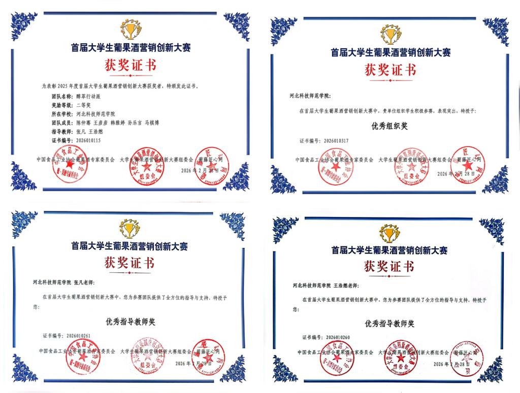 食品科技学院对本次赛事高度重视,精心组建参赛团队,由张凡、王浩燃两位老师全程悉心指导、全程跟进。备赛与竞赛期间,陈仲骞、王彦彦、韩雅婷、孙乐言、马祺博五名同学立足专业所学,紧密结合葡果酒产业发展趋势与年轻消费群体市场特征,多次打磨优化营销策划方案,持续提升实战执行能力。最终,团队凭借新颖独到的营销思路与扎实亮眼的销售业绩,在全国众多参赛队伍中脱颖而出,荣获大赛全国二等奖。张凡、王浩燃两位教师获评“优秀指导教师奖”。