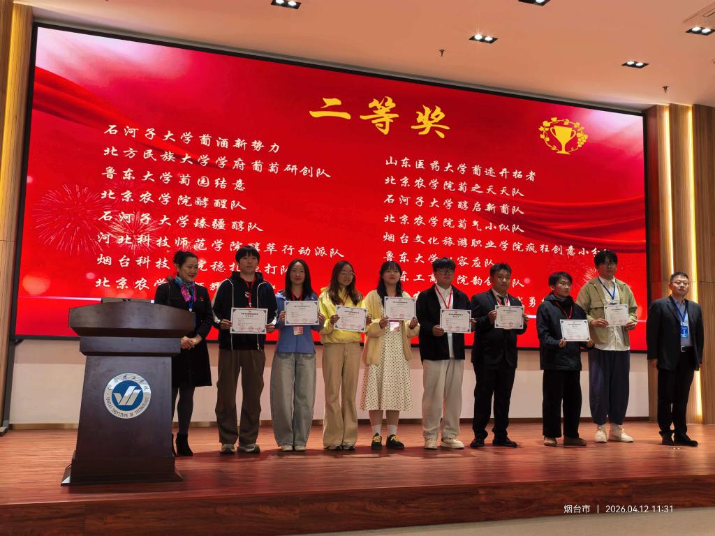 4 月 12 日,全国首届大学生葡果酒营销创新大赛颁奖典礼在烟台理工学院隆重举行。本次大赛历时 51 天,历经赛事比拼与销售实践多环节考核,我院学子在来自全国 24 所高校的 98 支参赛队伍中脱颖而出,最终位列第 15 名,荣获大赛全国二等奖。同时,学校获评优秀组织单位,2 名教师荣获优秀指导教师奖。