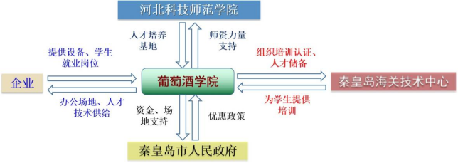 河北科技师范学院食品科技学院学院依托葡萄酒产业聚集区的区域优势,坚持“素质与技能并重、学校与社会结合”的办学理念,以提升人才培养质量为目标,围绕生产性实训和顶岗实习,推进“学训交替”人才培养模式改革,不断提高人才培养水平。学院与秦皇岛市人民政府和企业合作,形成政校企合作新机制,于2017年9月设立河北科技师范学院葡萄酒学院,由河北科技师范学院与秦皇岛市人民政府、中粮华夏长城葡萄酒有限公司、朗斯酒庄(秦皇岛)有限公司、茅台葡萄酒厂(集团)昌黎葡萄酒业有限公司、秦皇岛海关技术中心等单位共建。